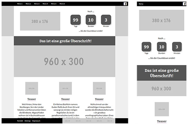 Bei der konkreten Umsetzung in Templates (Vorlagen) wird aus Design das responsive Design. Die Style-Vorgaben werden so definiert das sowohl große als auch kleine Bildschirme die Website optimal darstellen. Responsive Design ist bei mir übrigens Standard. Da die mobile Nutzung des Internet die klassiche Nutzung via Desktop-Computer überholt hat, macht es keinen Sinn eine Website nicht responsive zu gestalten.